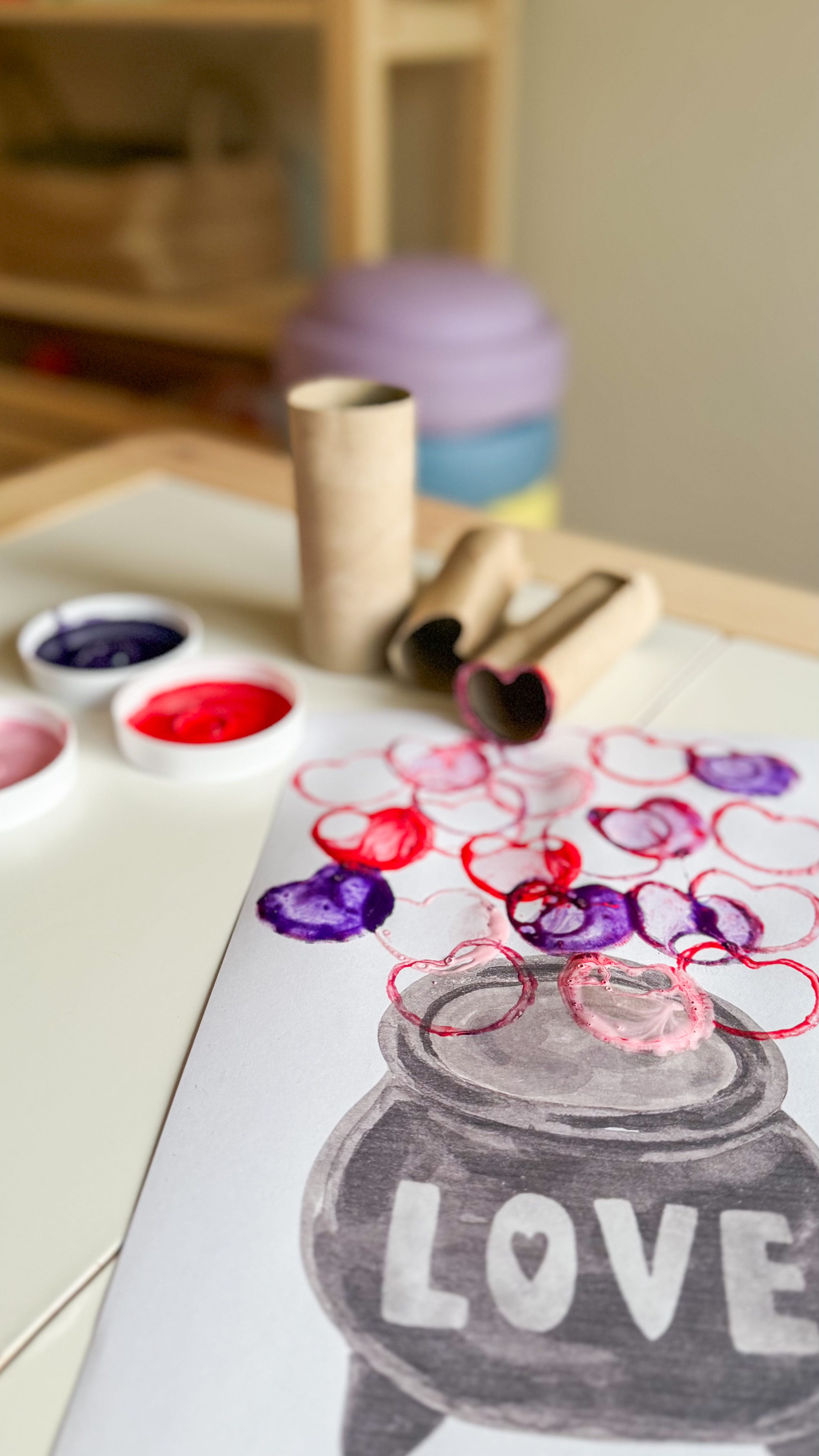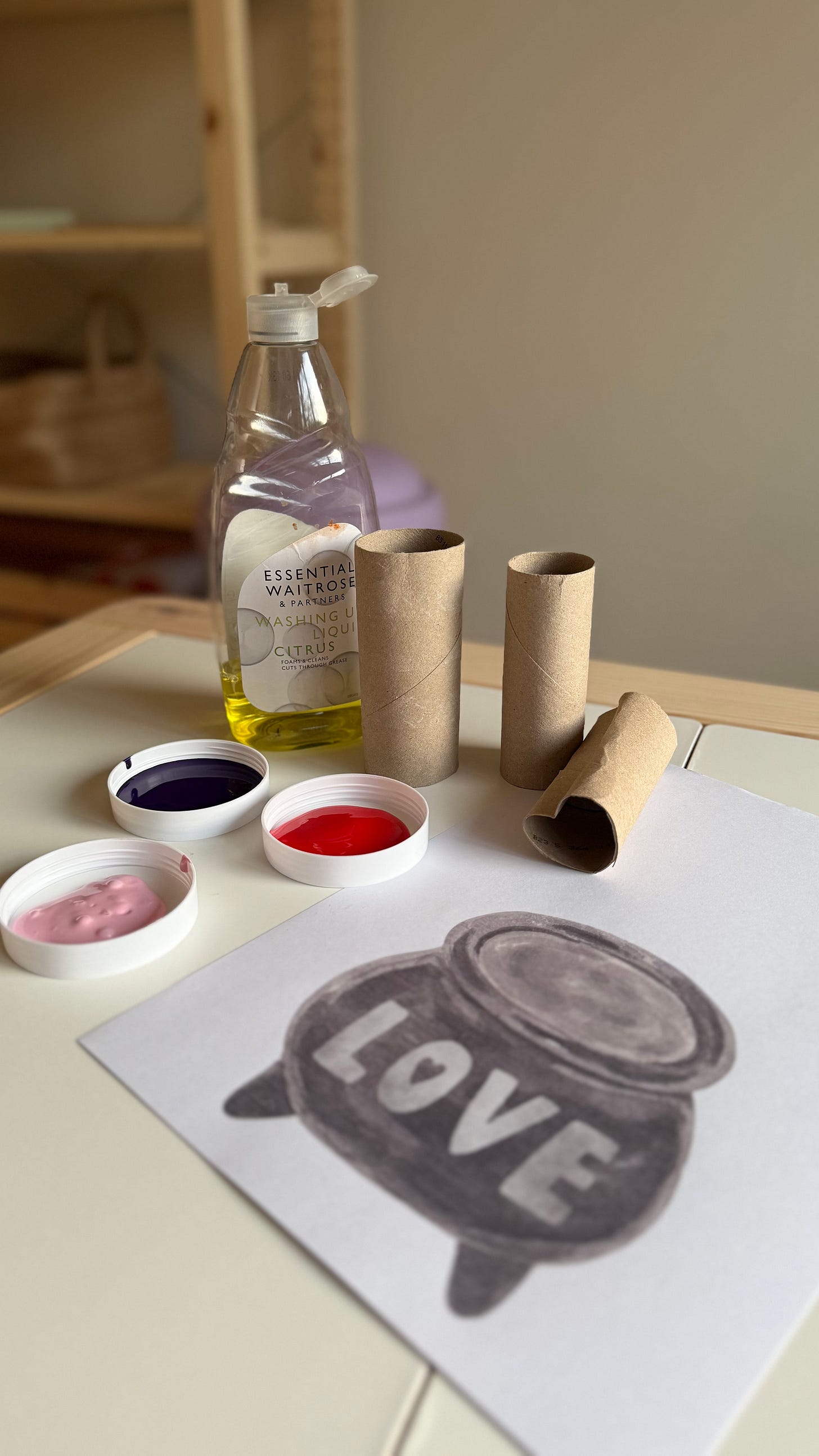 For this activity all you need to do is get your toilet rolls and bend them slightly in the middle so they look like a heart shape. Then get your paint and pour your paint into different containers. Add a little bit of fairy liquid to each of the paints and give it a good mix. Then get your little ones to stamp their heart toilet roll into the paint, and then stamp it onto the paper. Get them to do this all over the top of the cauldron to create a Love Potion! Top tip is don’t make the activity too watery or add too much paint as it will run!